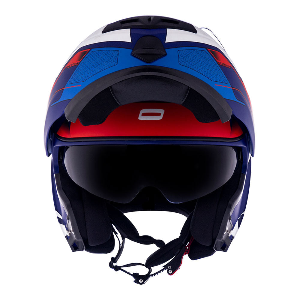 Para começar, ele possui uma viseira de 2,2 milímetros, em policarbonato, opticamente correta e plana, resistente a riscos e com proteção UV. O óculos interno agora conta com sistema de acionamento suave pela lateral, que contribui para a praticidade e conforto do casco. As vantagens deste capacete modular ficam ainda mais evidentes quando falamos do sistema de ventilação multicanais, estrategicamente integrado ao EPS, com uma eficiente entrada de ar frontal inferior, ampla abertura de ar superior, quatro saídas de ar inferiores e spoiler traseiro, que além de melhorar a aerodinâmica e o design do casco, possui inserções refletivas que ajudam em condições de pouca visibilidade.